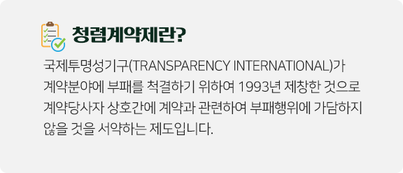 '청렴계약제'를 도입하여, 협력업체와의 거래 시 각종 뇌물이나 선물, 향응접대, 편의제공 등을 요구하거나, 받거나, 받기로 약속하거나 결탁하여 일방에게 유리한 또는 불리한 판단을 내리지 않도록 서약하는 제도를 시행하고 있습니다. 본 제도는 거래 업무 계약 시, 협력업체와 거래 부서 간에 청렴한 거래를 할 것을 다짐하는 절차로서 입찰 전에 청렴계약제 안내문을 작성하여 충분히 이해할 수 있도록 공고하고, 계약담당자와 계약업체가 청렴계약이행각서를 각각 작성하여 계약서에 첨부하도록 하고 있습니다.